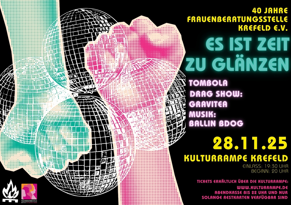 Die Frauenberatungsstelle Krefeld e.V. gibt es in diesem Jahr seit 40 Jahren und das feiern wir öffentlich in der Kulturrampe Krefeld, mit allen, die die Gleichberechtigung aller Geschlechter und den Kampf gegen Sexismus zelebrieren möchten.