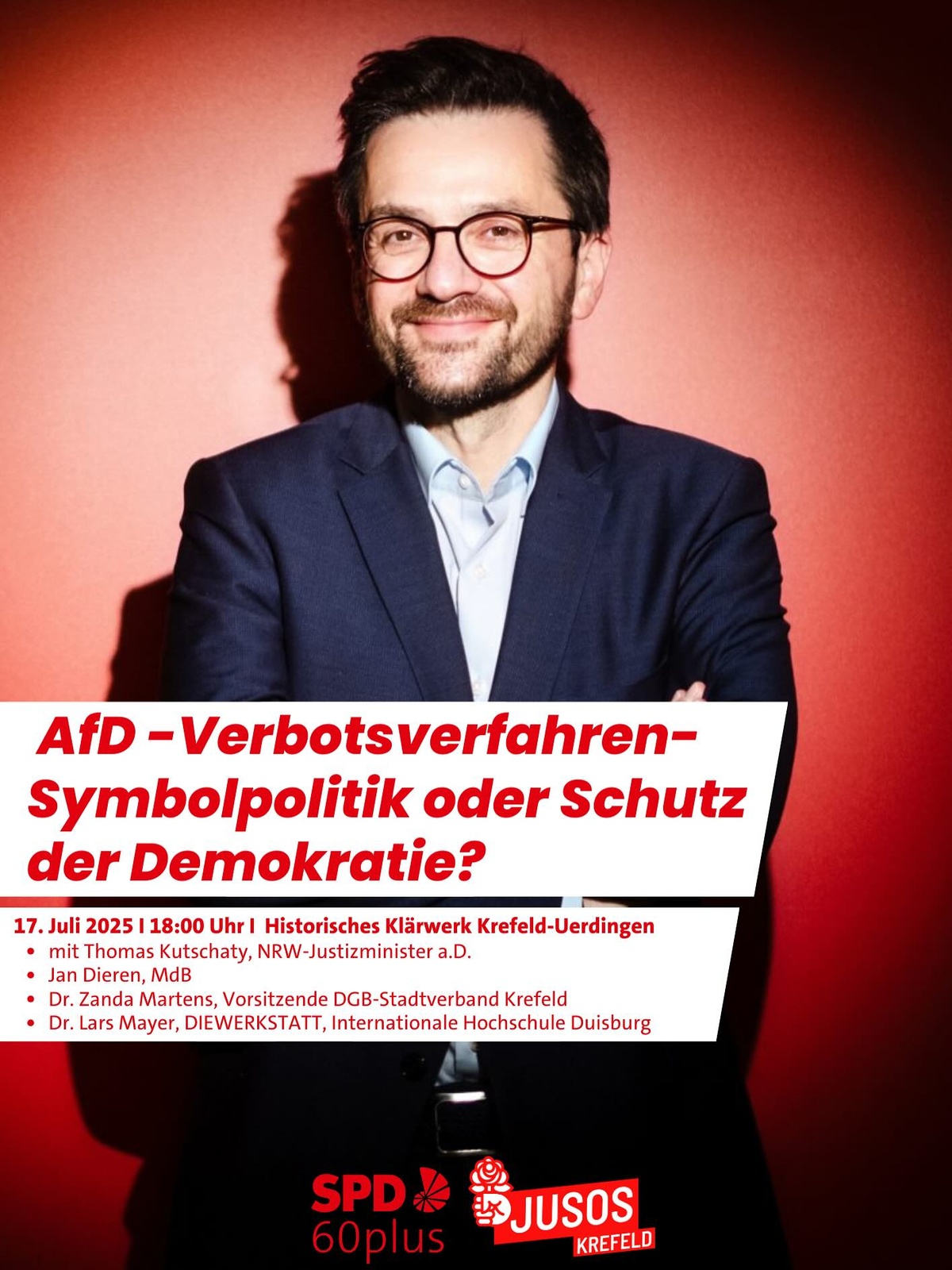 Verbindliche Anmeldung bis zum 16.07.2025 an vorstand.jusoskrefeld@gmail.com Im Klärwerk Krefeld-Uerdingen diskutieren wir mit hochkarätigen Gästen über eines der brisantesten Themen unserer Demokratie. Mit dabei:🗣️ Thomas Kutschaty – ehemaliger NRW-Justizminister🗣️ Jan Dieren – unser Bundestagsabgeordneter🗣️ Dr. Zanda Martens – DGB-Vorsitzende Krefeld🗣️ Dr. Lars Meyer – Internationale Hochschule Duisburg 👉 Sei dabei und diskutiere mit uns über …