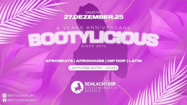 Am 27.12.2025 feiern wir nicht nur die letzte Bootylicious des Jahres –wir feiern 6 YEARS ANNIVERSARY! 🍑🎧 AfroBeats | AfroHouse | Hip Hop | Latin 🎧🍑