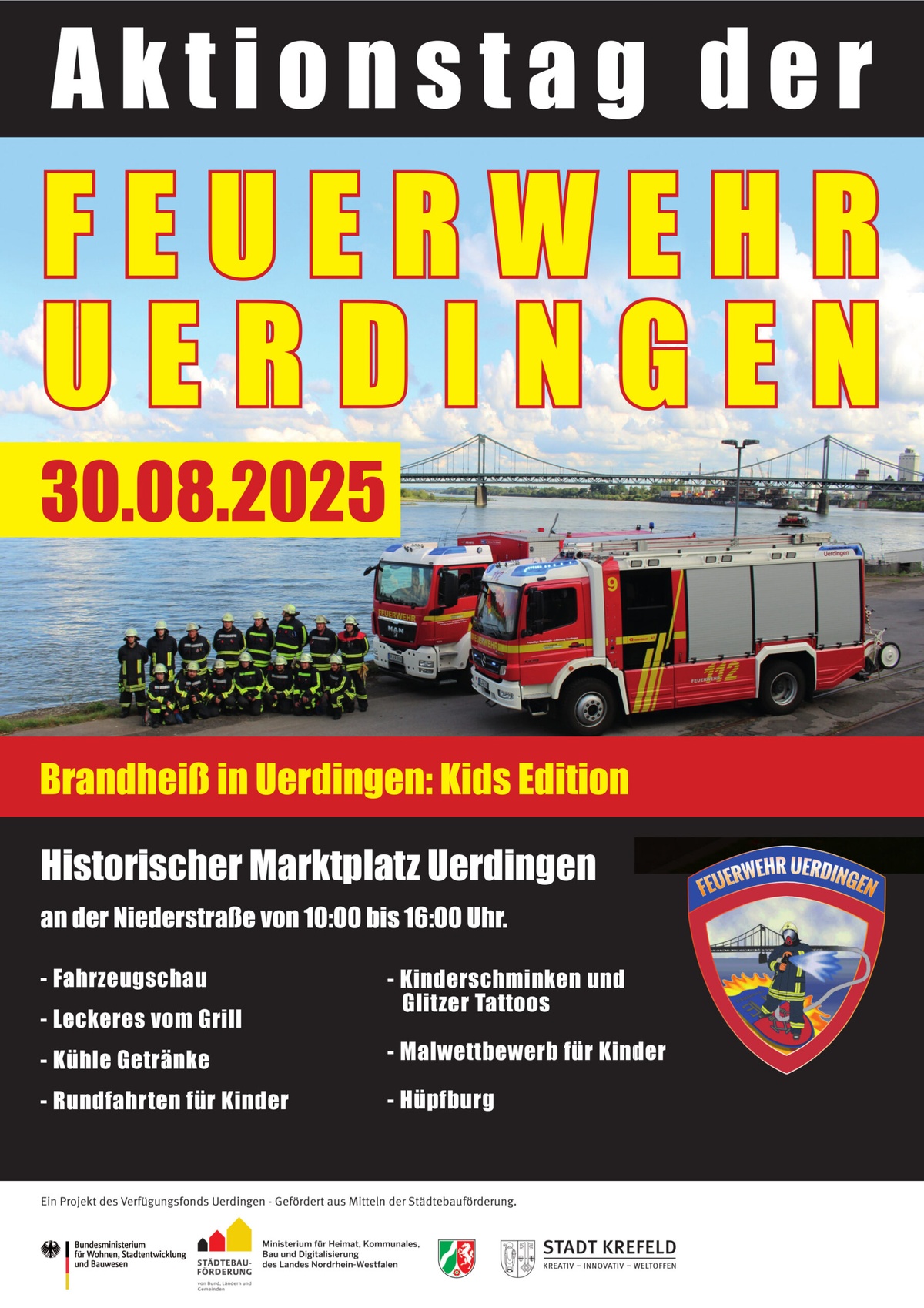 Aktionstag der Freiwilligen Feuerwehr Uerdingen Mit einem Buntem Programm für Jung und Alt – Fahrzeugschau – Leckeres vom Grill – Kühle Getränke – Rundfahrten für Kinder – Kinderschminken und Glitzer