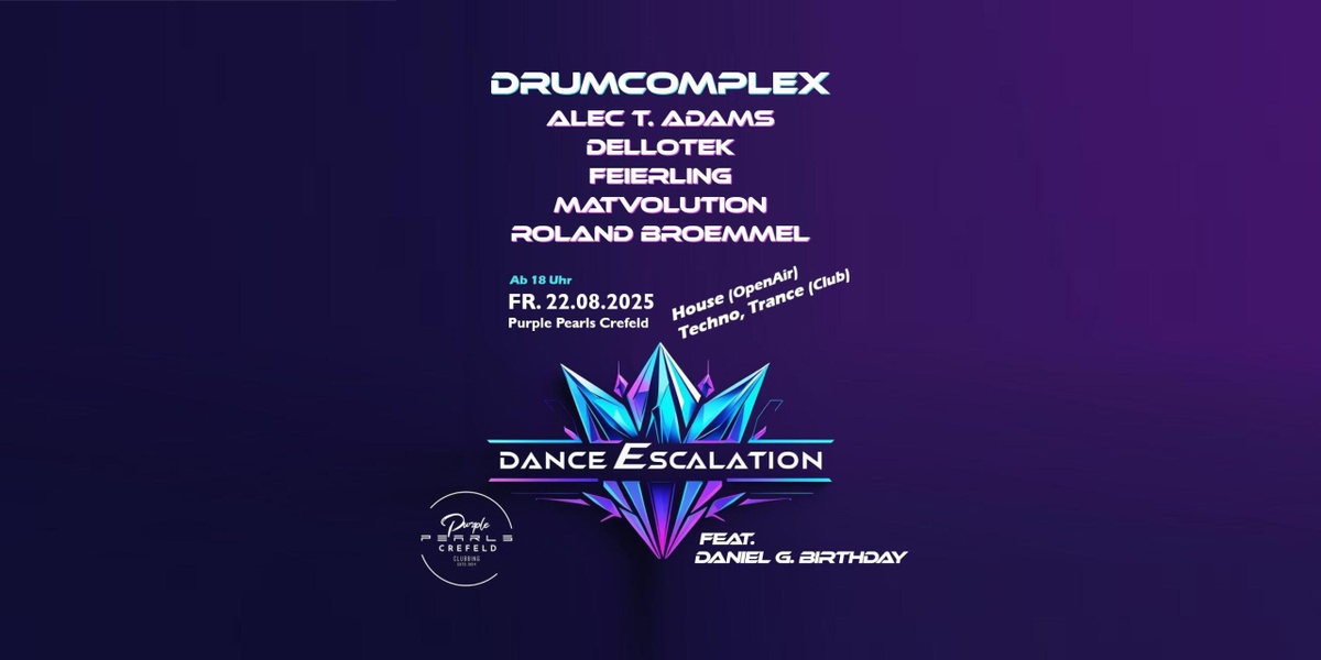 THE FINEST IN TECHNO, TRANCE & HOUSE! Die neue Veranstaltung in Krefeld! Dance Escalation feat. Daniel G. Birthday Ab 18 Uhr öffnen wir den Außenbereich und empfangen Euch mit guter