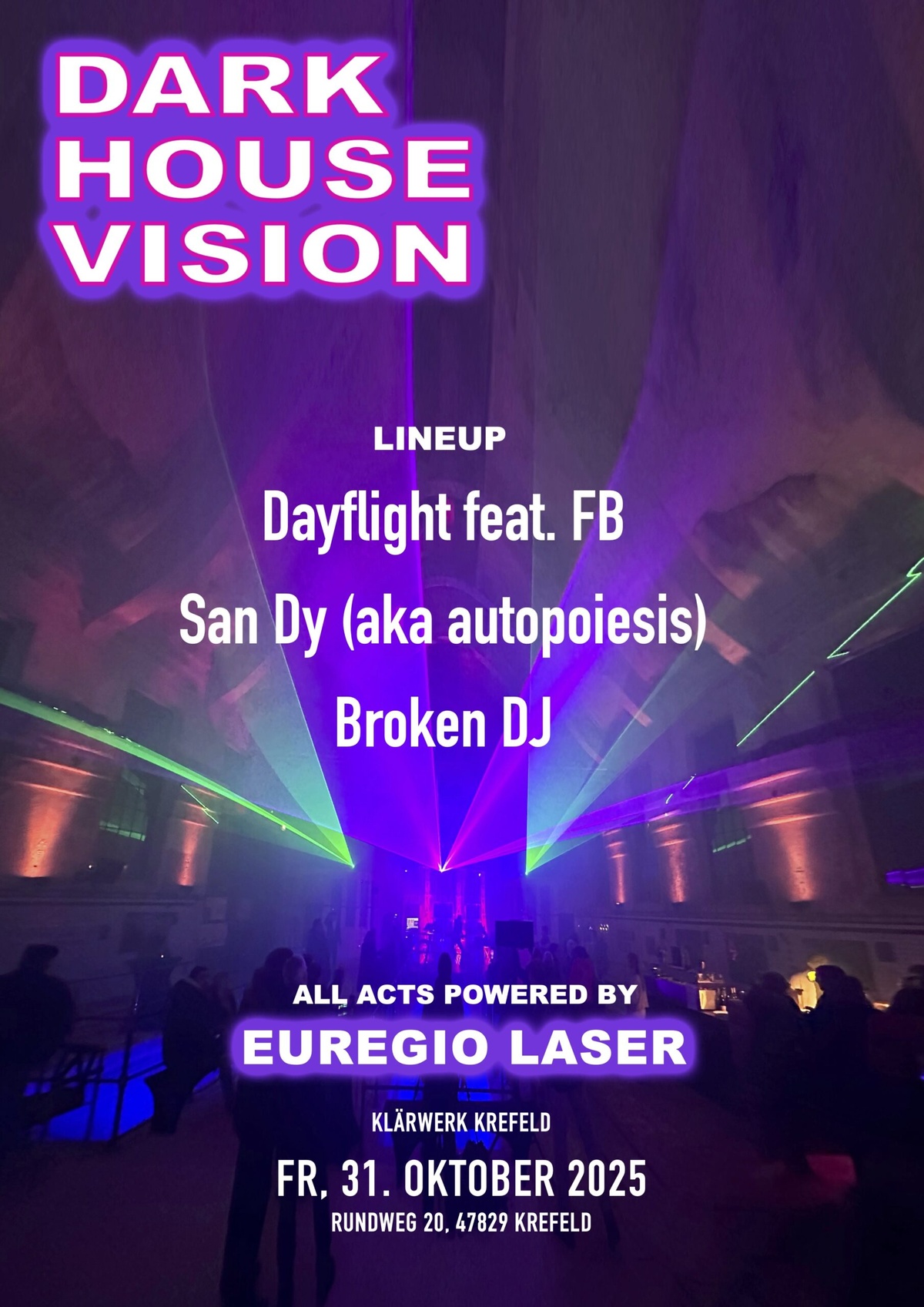 Halloween gehen wir es dark mit einer tanzbaren Soundlandschaft. Die drei DJs Dayflight feat. FB, San Dy (aka autopoiesis), und Broken DJ freuen sich sehr auf das dark Ambiente des Klärwerks. Sie werden supported durch eine unfassbar gute Lasershow die wir letztes Jahr nur ausprobiert hatten... HOUSE • MINIMAL TECHNO • FREESTYLE • ELECTRO • …