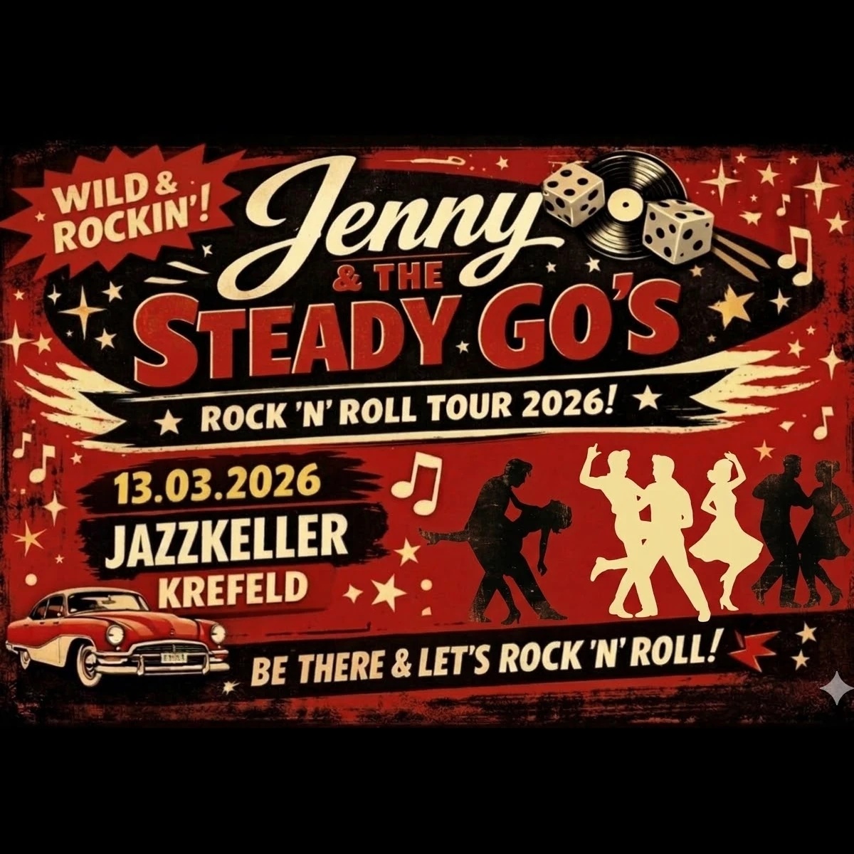 Schon ohne Jenny sind die Steady Go’s ein rockendes und rollendes Feuerwerk, doch mit Jenny sind sie pures Dynamit – und ein Riesenspaß für alle Generationen. Neben Fifties-Originalen befeuern auch eigene Klassiker die Tanzfläche. Hier bleibt kein Auge trocken und keine Hüfte unbewegt. Kommt Tanzen (aber bitte verschont das Mobiliar…)!