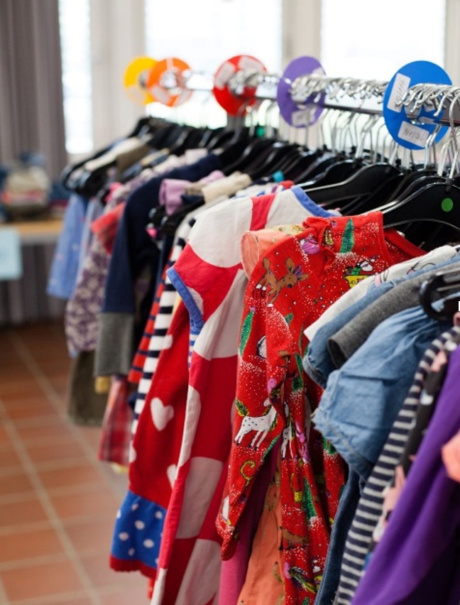 Kinderbasar des Schülerunternehmens “Lena & Leon” Einkauf in ruhiger Atmosphäre. Die Kleidung wird nach Größen sortiert angeboten. Es gibt ausreichend Platz für Kinderwagen. Es steht Kaffee und Getränke/ Snacks für