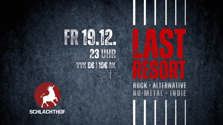 Der Schlachthof wird zur Rockzone!Mit LAST RESORT startet eine neue Partyreihe für alle, die Rock nicht nur hören, sondern fühlen:90er & 2000er Rock, Alternative, Nu Metal und Indie – dazu ausgewählte Klassiker und neue Tracks für den perfekten Mix.
