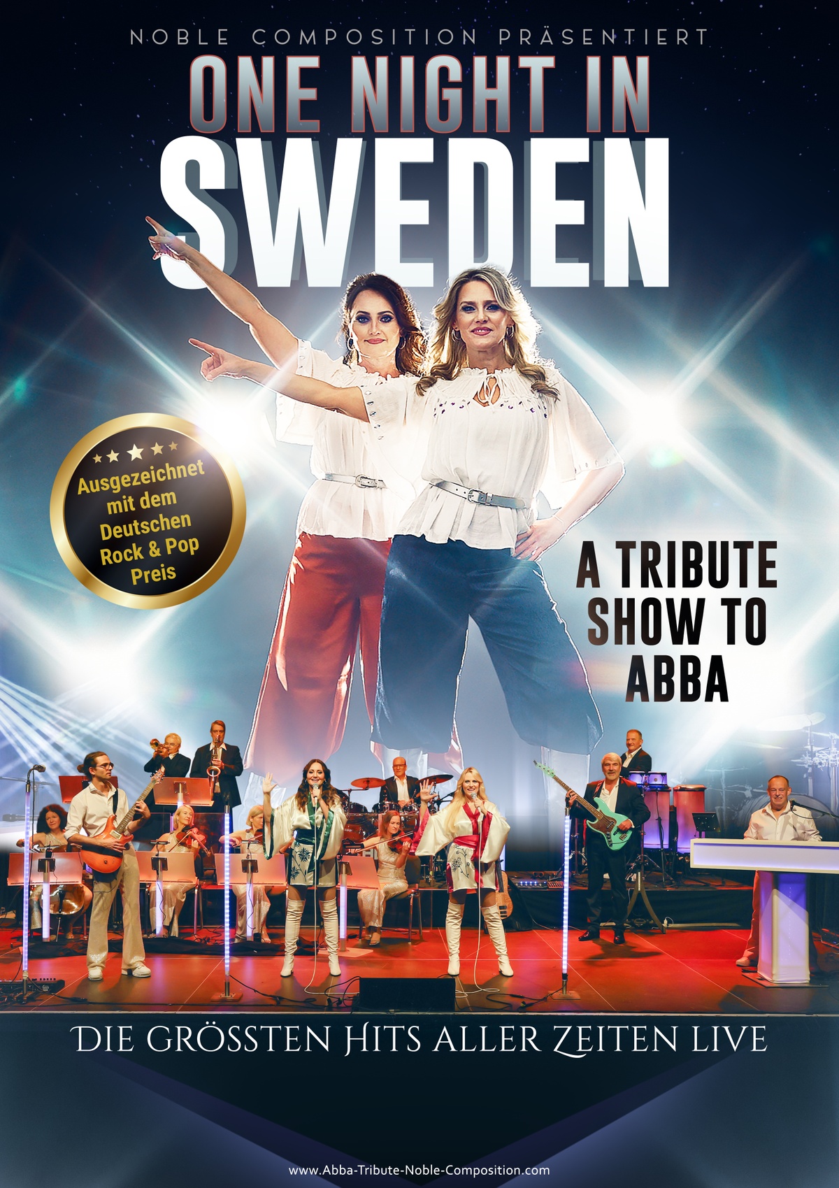 Noble Composition steht für eine Formation aus professionellen Live- und Studiomusikern der nationalen und internationalen Musikszene, die zu den erfolgreichsten Bands und Orchestern in Europa zählen. Sie lieben und leben die Musik von ABBA! Genau das ist der Grund, warum sie sich im Jahr 2021 den musikalischen Wunsch erfüllt haben, eine eigene ABBA-Tribute-Show auf die Bühne zu bringen. Ursprünglich unter Noble Composition Orchestra präsentiert die Band seit Mitte 2025 ihre erfolgreiche ABBA TRIBUTE SHOW unter dem neuen Namen „ONE NIGHT IN SWEDEN“ (A TRIBUTE SHOW TO ABBA).Im Mittelpunkt dieser ABBA-Tribute-Show stehen die Sängerinnen Linda Mikulec (Agnetha) und Simone Kerchner (Anni-Frid). Beide Sängerinnen haben sich einen eigenen Namen in der Musikbranche aufgebaut und standen schon mit vielen bekannten Showgrößen auf der Bühne. Den Part von ABBA-Mitglied Björn Ulvaeus übernimmt bei ONE NIGHT IN SWEDEN Florian Brettschneider, der mehrere Wettbewerbe auf der klassischen Gitarre gewonnen hat. Benny wird von DD Döhrn am Piano übernommen und ist ein fester Bestandteil in sämtlichen Besetzungen von Noble Composition. Ergänzt wird die Band durch Bandleader und Drummer Thomas Bleser, der zu den bekanntesten “Allround-Drummern“ Deutschlands gehört, sowie “Bassprofessor“ Andreas Düro.Eine mitreißende Bühnenshow mit Stimmen nah am Original, sowie eine einzigartige Bühne, die den entsprechenden Rahmen dazu stellt. Noble Composition garantiert mit ONE NIGHT IN SWEDEN eine ABBA-Tribute Show auf höchstem Niveau! Die Referenzen der beteiligten Musiker sprechen für sich.Weitere Informationen unter: www.abba-tribute-noble-composition.com