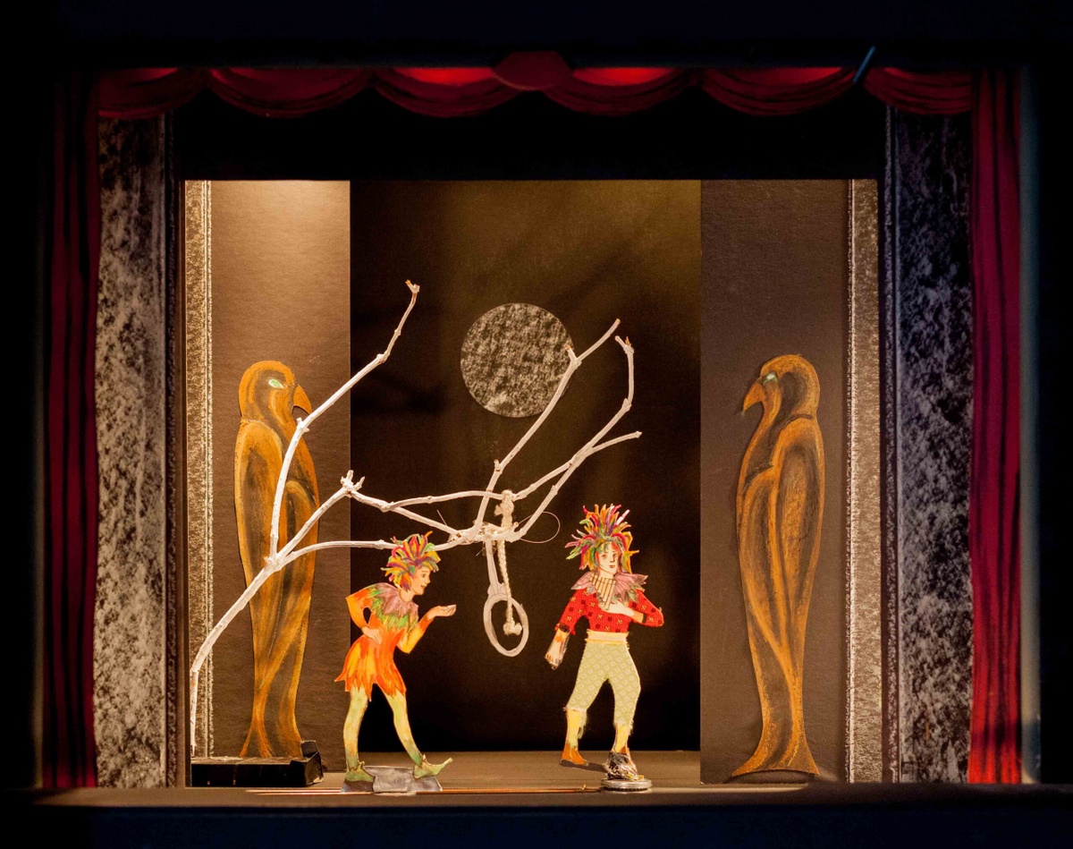 Eine kleine Bühne aus Papier. Mit Beleuchtung, Schnurboden, mehreren Kulissen, einem Vorhang und mit einem Erzähler, der durch die Geschichte führt und gleichzeitig technische Veränderungen des Theaters erläutert. An diesem