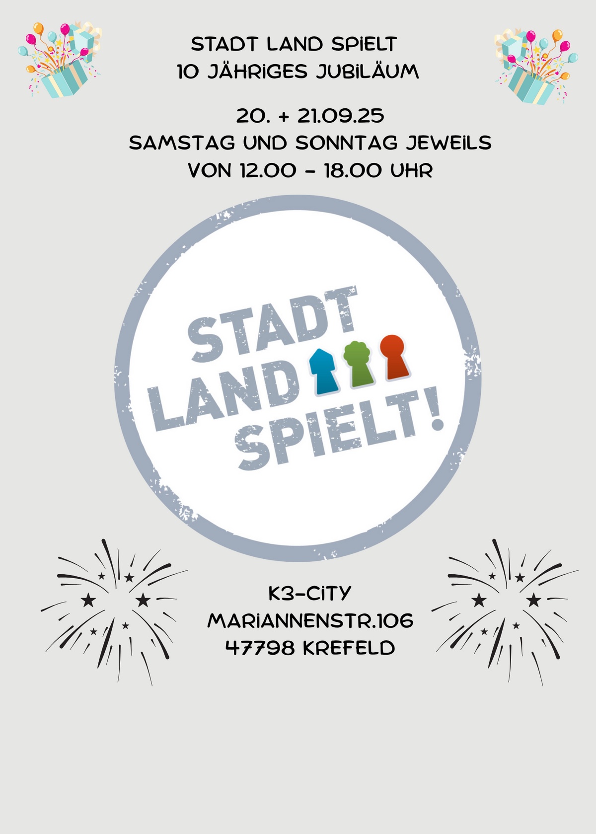 In Kooperation mit dem K3-City Jugendzentrum feiern wir, die Brettspiel-Verrückten, in diesem Jahr unser 10 jähriges Stadt Land Spielt Jubiläum. In diesem Jahr haben wir uns etwas besonderes für euch