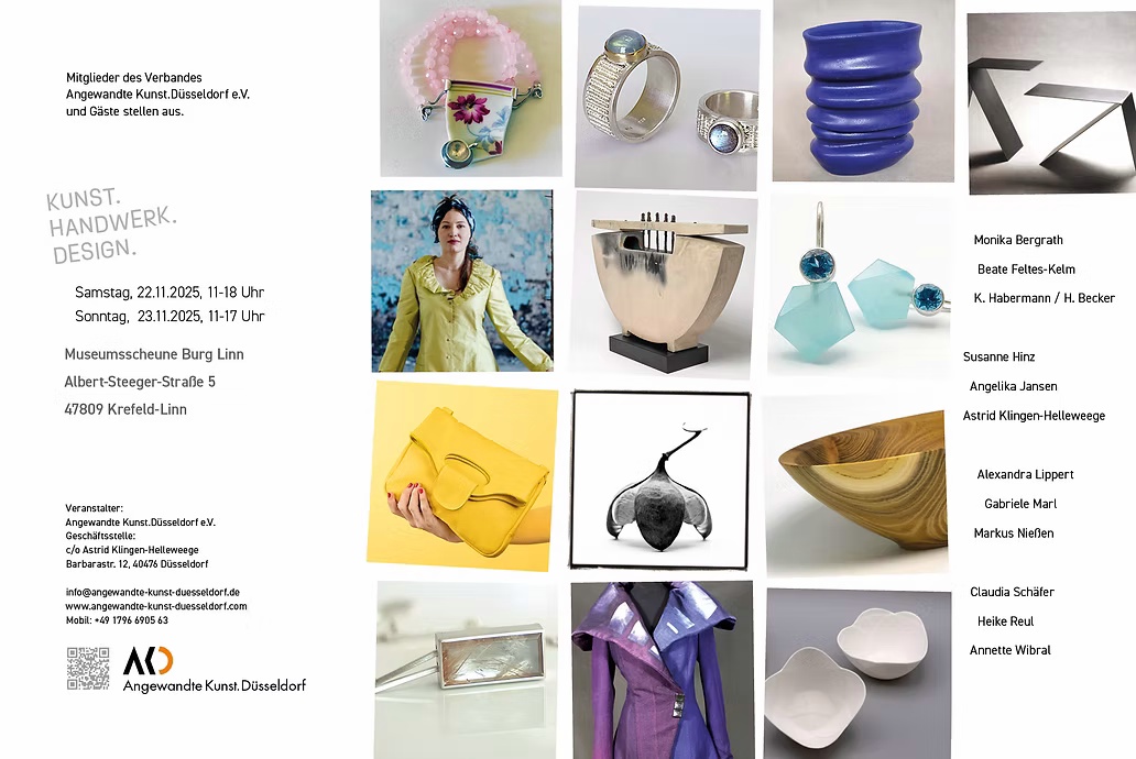 Verkaufsausstellung KUNST.HANDWERK.DESIGNMuseumsscheune Burg Linn 12 Künstlerinnen und Künstler, Kunsthandwerkerinnen und Kunsthandwerker zeigen ihre einzigartigen Werke aus den Bereichen Schmuck, Mode, Keramik, Porzellan, Holz, Leder und Metall , die individuell hergestellt