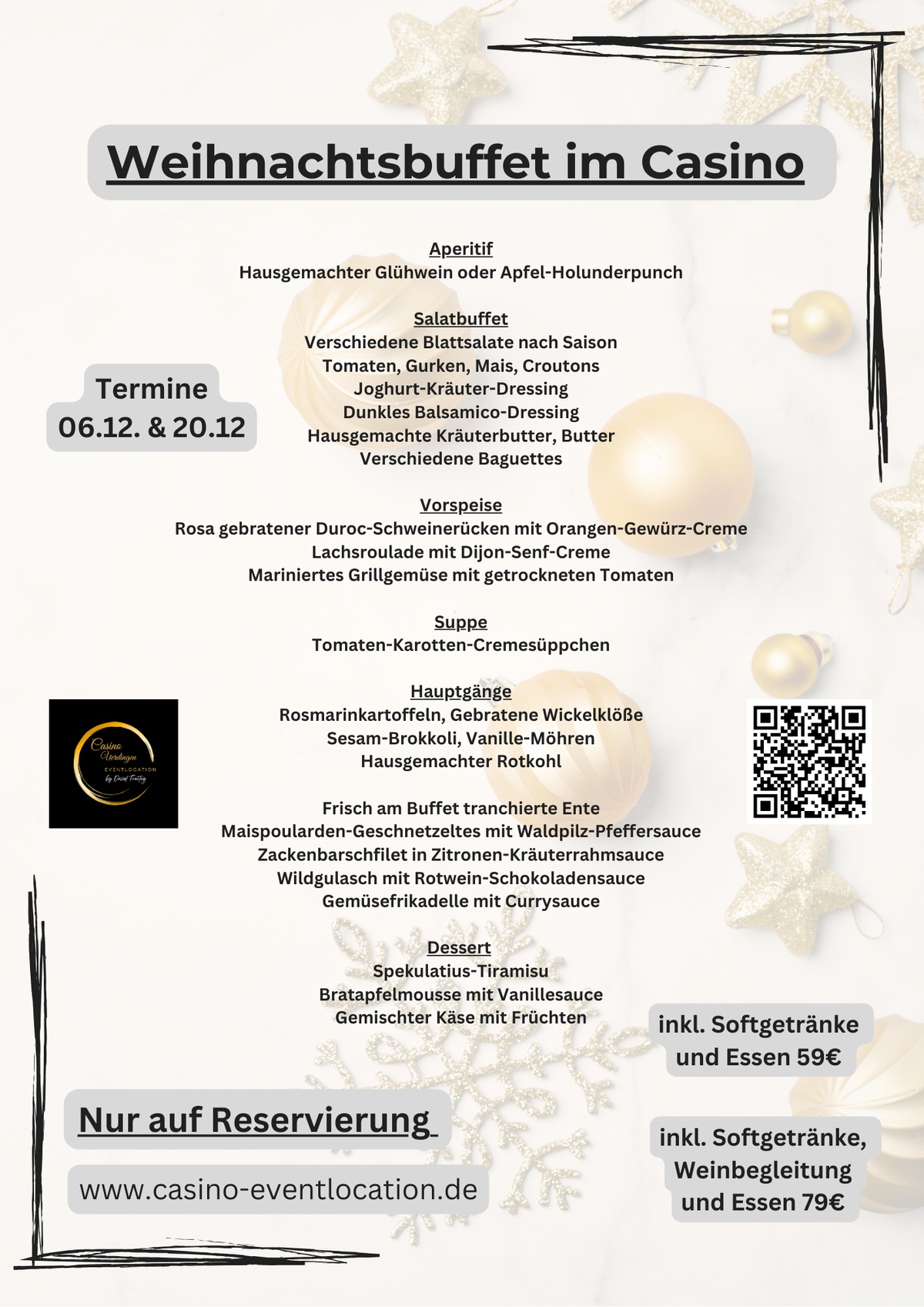 Genießen Sie ein festliches Weihnachtsbuffet im exklusiven Ambiente des Casinos. In einer stimmungsvollen, weihnachtlich dekorierten Atmosphäre erwartet Sie ein umfangreiches Angebot an kulinarischen Köstlichkeiten. Von traditionellen Weihnachtsgerichten bis hin zu