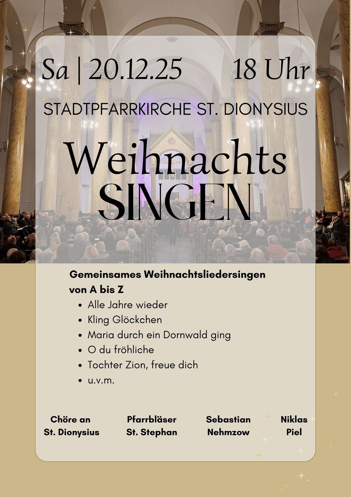 Wir laden herzlich zum offenen Weihnachtssingen am Samstag, 20.12.25, um 18 Uhr in die Stadtpfarrkirche St. Dionysius ein. Zur Einstimmung in die Weihnachtszeit singen wir gemeinsam Advents- und Weihnachtslieder von