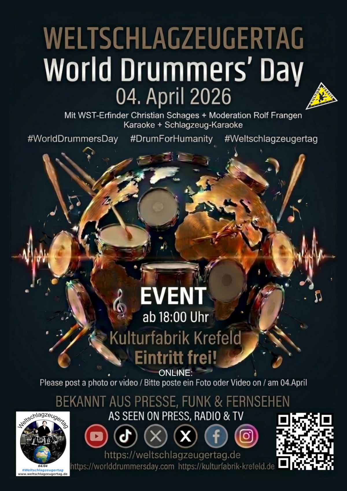 Wir feiern am Internationalen Weltschlagzeugertag – World Drummers‘ Day 2026 die Schlagzeuger und Trommler (m/d/w) dieser Welt. Dieser Welttag wurde 2013 in Krefeld ausgerufen und geht seitdem um die ganze Welt. Der Erfinder dieses Welttages, Christian Schages, lädt alle Schlagzeuger, Trommler, Percussionisten, Musiker und Nichtmusiker ein, diesen besonderen Tag in der Krefelder Kulturfabrik zu feiern und wird als Botschafter auch persönlich anwesend sein. Der ganze Abend dreht sich ums Trommeln, es gibt Schlagzeug-Karaoke und es darf auch gesungen werden, denn wir stellen tausende Karaoke-Titel für euch bereit und das bei freiem Eintritt!